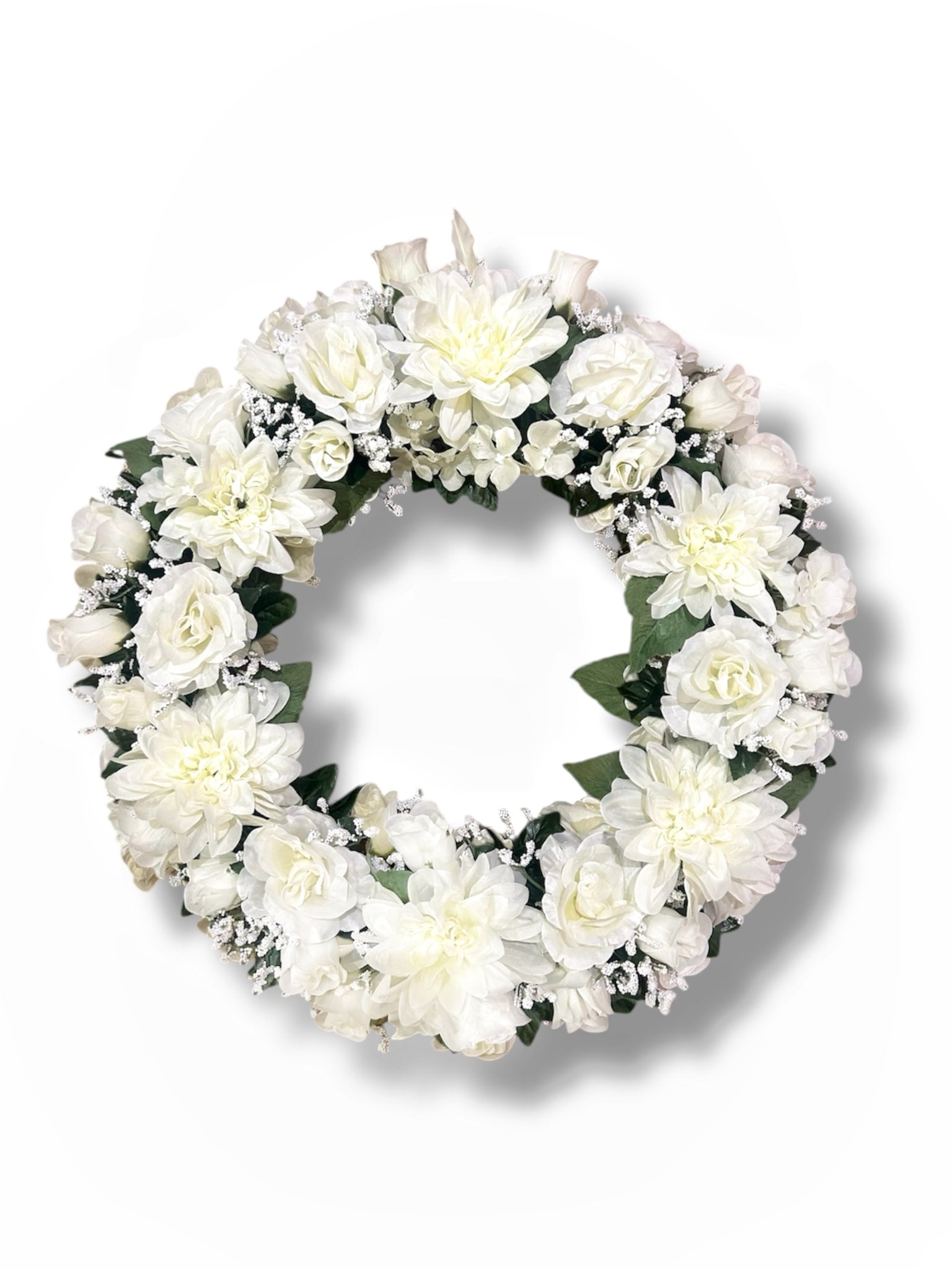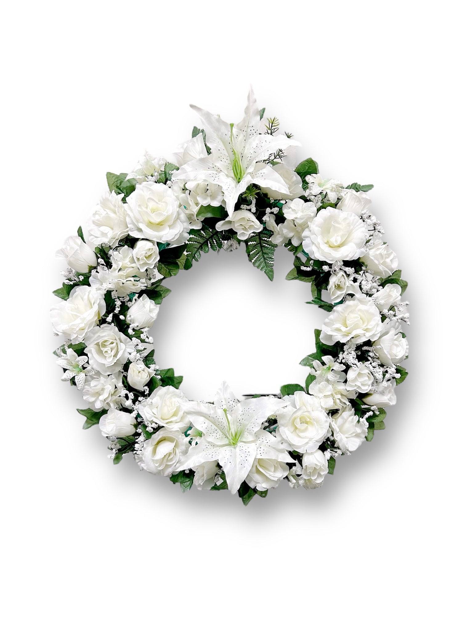 Featuring white artificial flowers like peony, rose, and baby's breath, the Timeless Petal Memorial Wreath exudes elegance and texture. This wreath brings a sophisticated touch to any memorial.