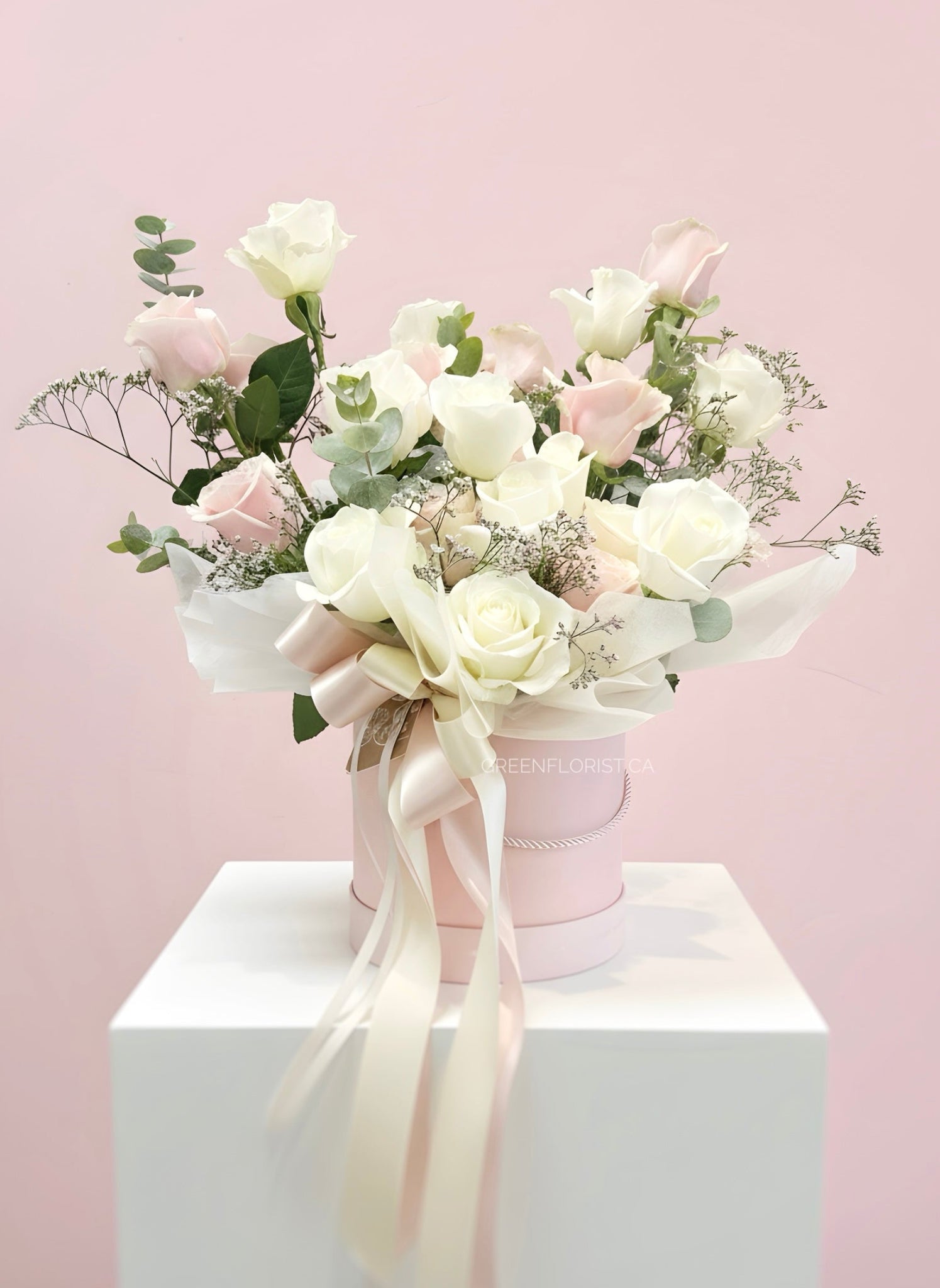 White & Soft Pink Roses · Pale Pink Hat Box