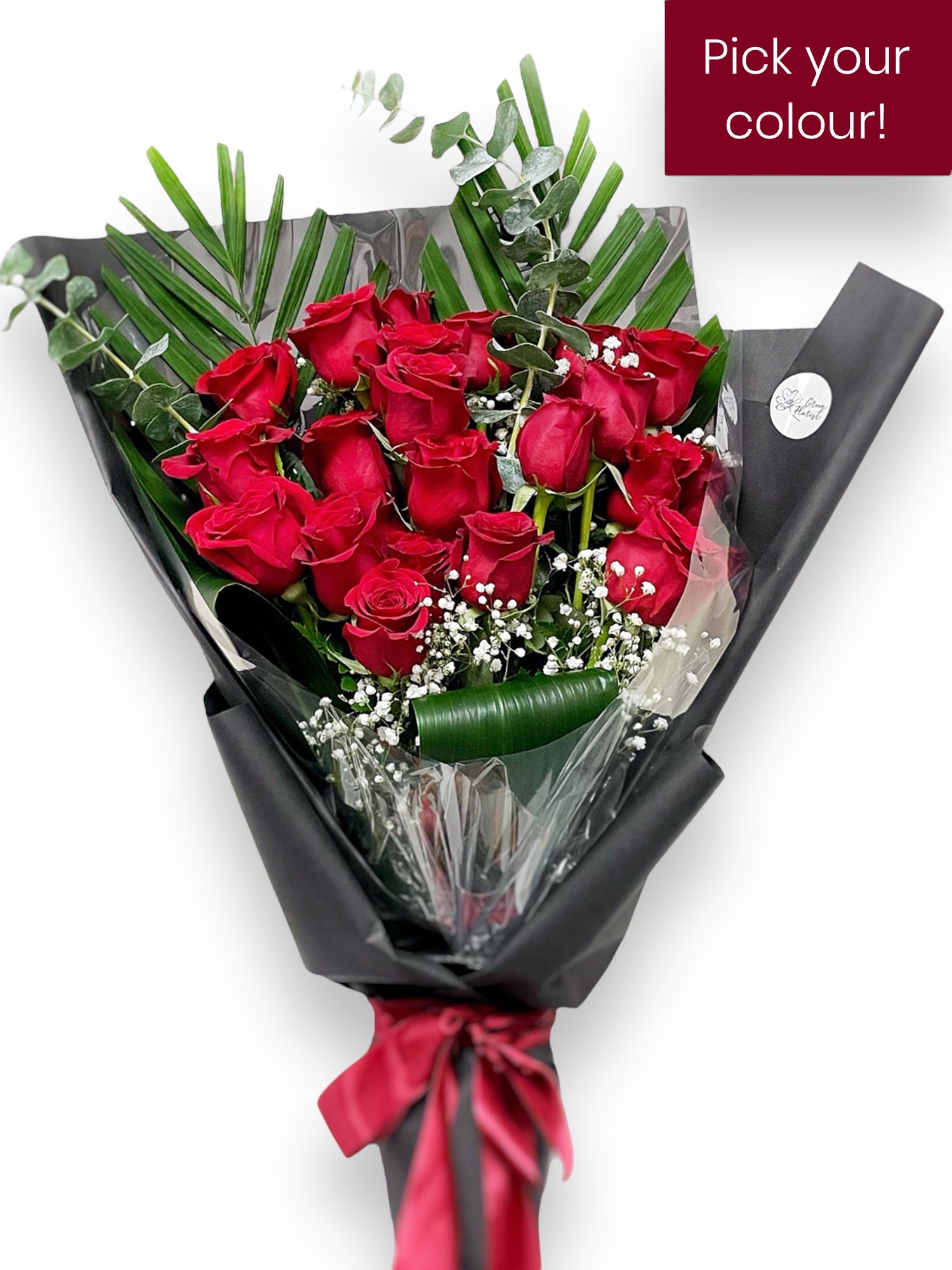 Rose bouquet with choice of 3 sizes with accent flowers and greenery presented in designer’s choice wrapping.